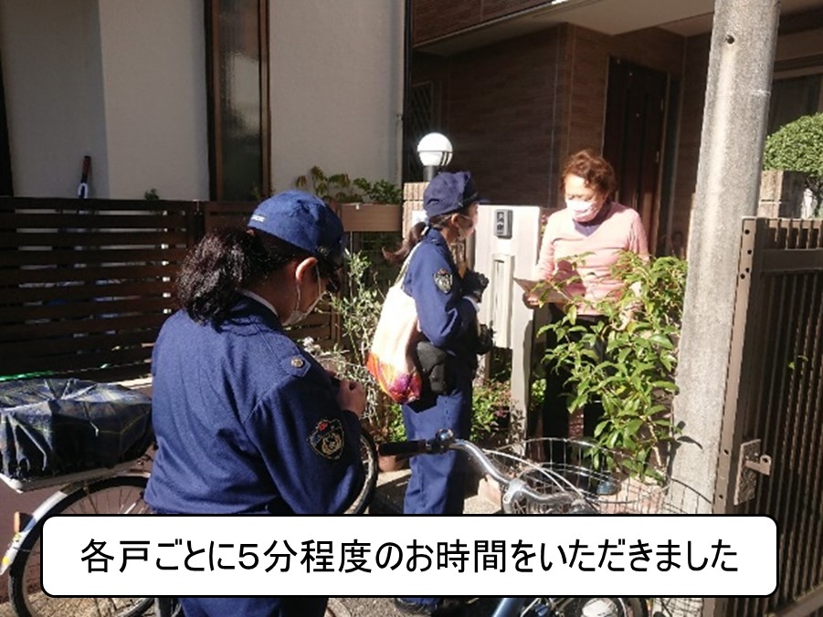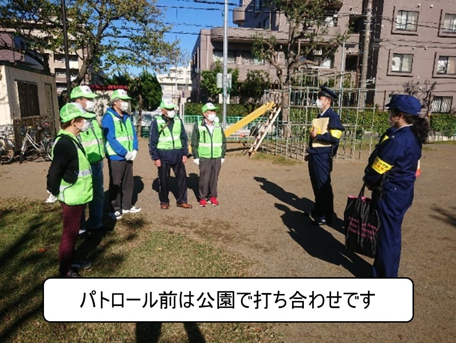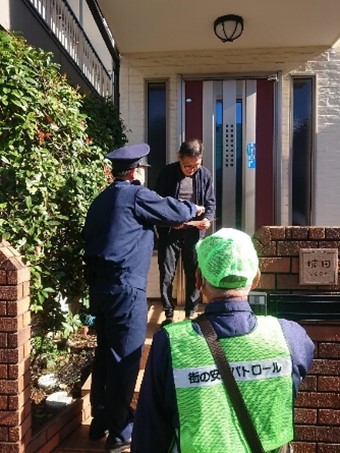 パトロールは去る10月20日(水)に実施いたしました。行徳警察署から3名、自治会から役員5名の計8名でチームを編成し、戸建てにお住いの会員宅を個別訪問させていただきました。各戸では資料を提示しつつ特殊詐欺の手口や予防方法について話をさせていただきました。詐欺以外にも自動車の盗難が増えていると警察官からお話があったようです。