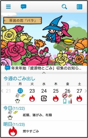 アプリを起動すると「ごみ収集日カレンダー」が表示されますので、ごみ収集日が一目でわかります。