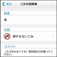 品名を入力すると分別方法を知らせてくれる「ごみ分別辞典」で廃棄方法に迷うことが少なくなるかもしれません。左記は「傘」を調べたところです。