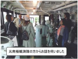 続いて臨海副都心にある「船の科学館」に移動し、実際に南極観測隊に参加されたボランティアの方から当時の苦労話や極限地域での生活など詳らかに説明をしていただきました。