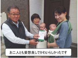 福栄二丁目に双子のお子さんがご誕生になったとお知らせいただきましたので、11月12日に、役員が訪問させていただき、お祝いの品を受け取っていただくことができました。