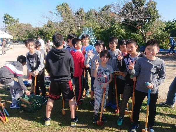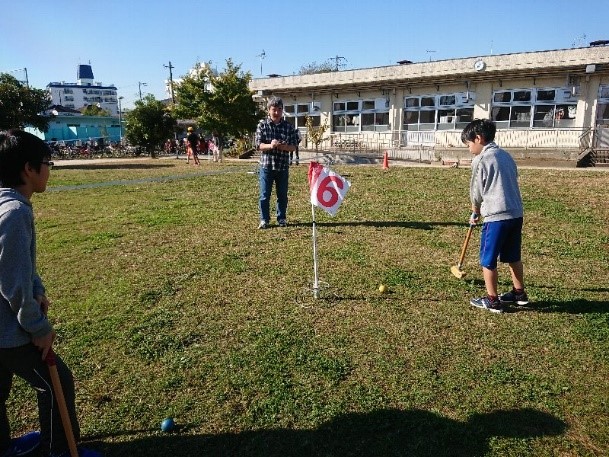 グラウンドゴルフは、高学年の児童向けに6ホール、低学年向けに2ホールを準備。ボールを打つ力加減に四苦八苦しながらも数ホールでコツをつかんで楽しそうな笑顔を見せるプレイヤーや、ホールインワンの達成で盛り上がっているグループなどを見ていると、こちらも自然に笑顔になってきます。