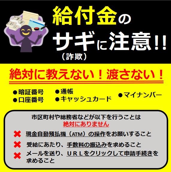 申請にあたり、自治体から次のような要請は絶対にありません。給付金詐欺には十分ご注意ください。
