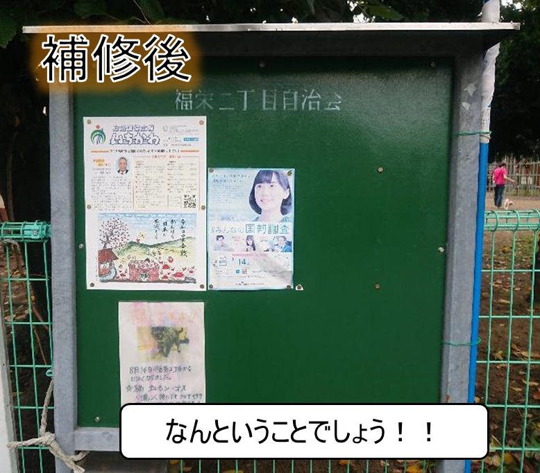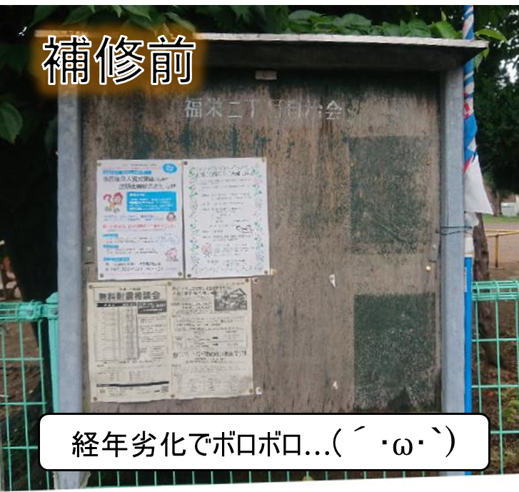 市川市地域振興課より本年度の補修補助金が6基分支給されることを受け、町内に設置されている掲示板のうち、損傷の激しいものについて補修を完了しております。補修済みの箇所は次の6ヶ所となります。