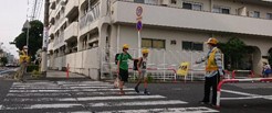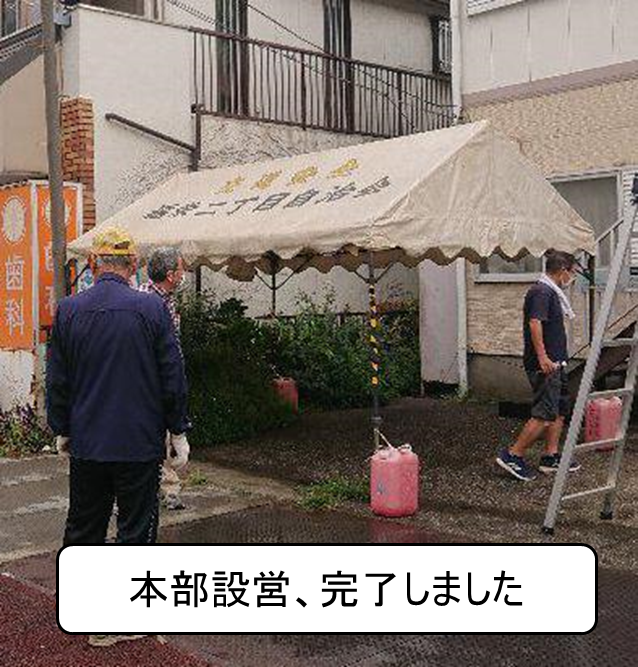 運動初日の21日(月)にコーポ中山ハウス前に本部テントを設営し、南新浜小学校児童の安全登校サポートに備えましたが、台風12号の接近のため実際の活動は28日(月)からになりました。