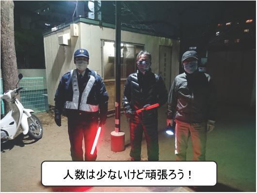 緊急事態宣言発出期間中である一月のパトロールは中止を確定しております。緊急事態宣言が延期された場合は、2~3月も実施いたしません。