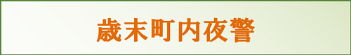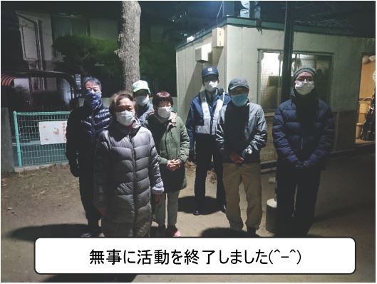 12月20日(日)~26日(土)まで巡回夜警を実施いたしました。例年は大勢の子どもさんに参加していただいていましたが、今回は数名の担当者だけで発声もない巡回となり、何やら寂しい雰囲気でした。期間中は問題となるような事案もなく無事に活動を終了いたしました。巡回には20日、21日を除いて地元警察の方にもご同行いただき頼もしかったです。